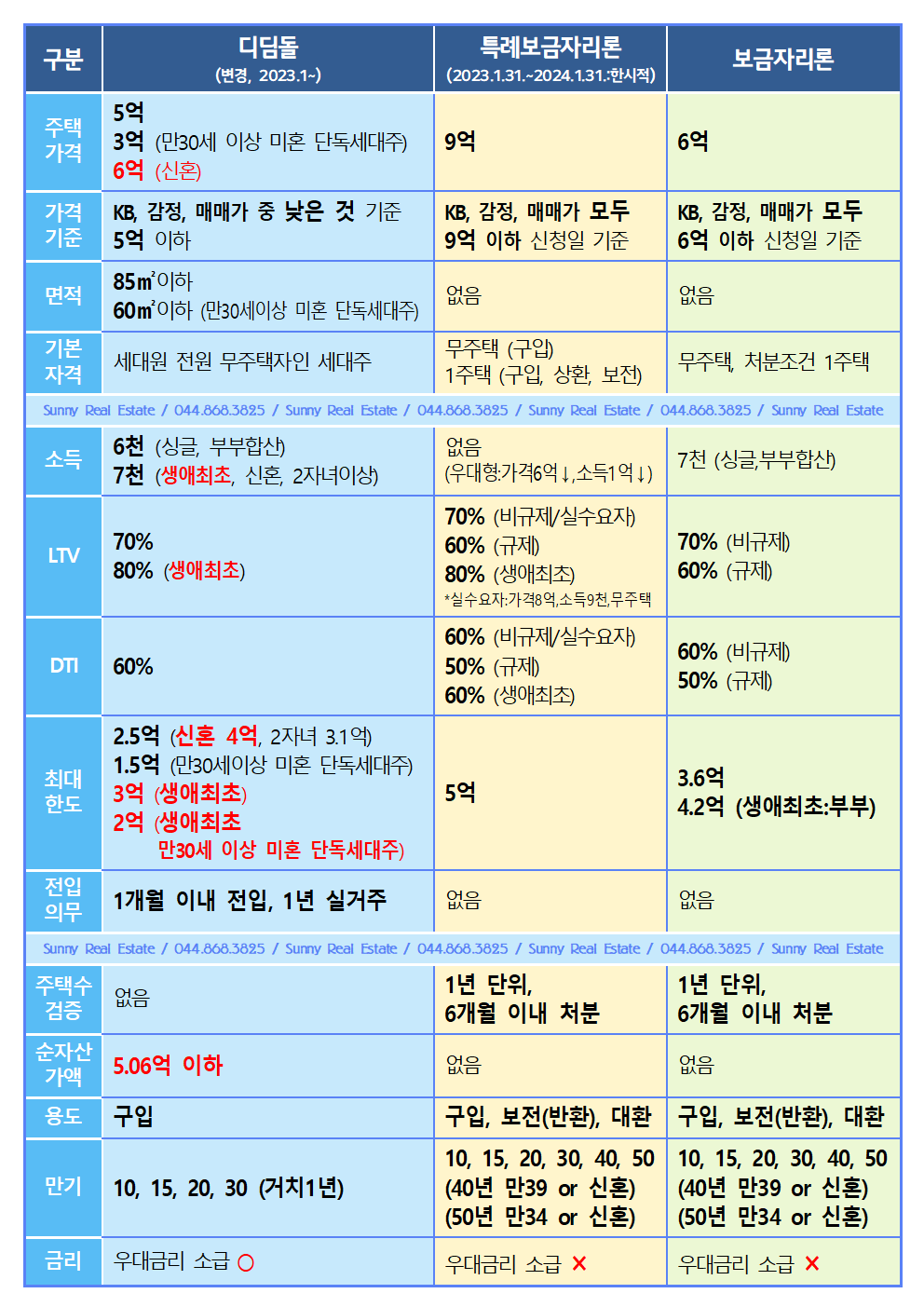 디딤돌, 보금자리론, 특례보금자리론 내용을 요약한 표입니다
